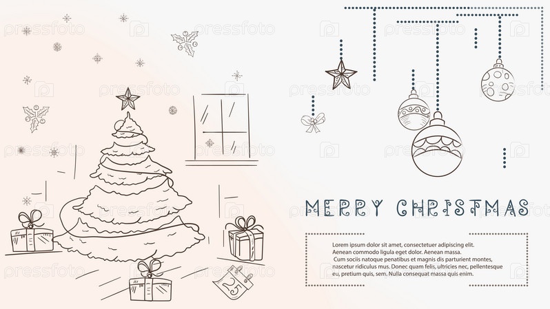 Рождественская контурная иллюстрация в стиле детских каракулей с текстом Lorem Ipsum праздничная елка и множество подарков