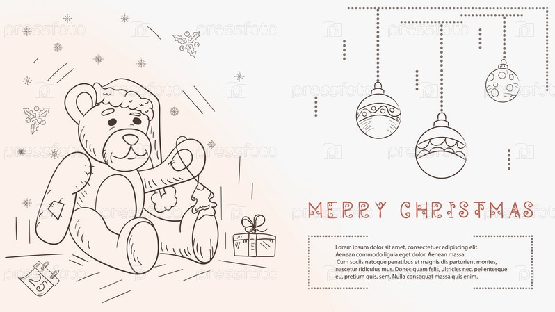 Рождественская контурная иллюстрация в стиле детских каракулей с текстом Lorem Ipsum игрушечный медведь в шляпе Санты