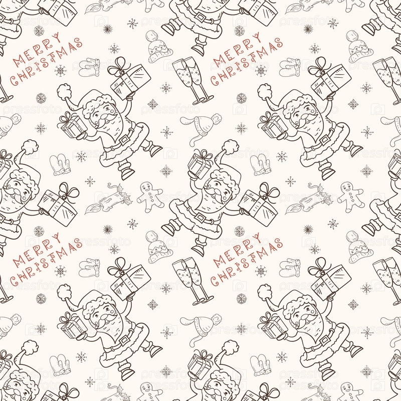 Рождественская бесшовная контурная иллюстрация в стиле детского каракуля Санта Клаус держит подарки