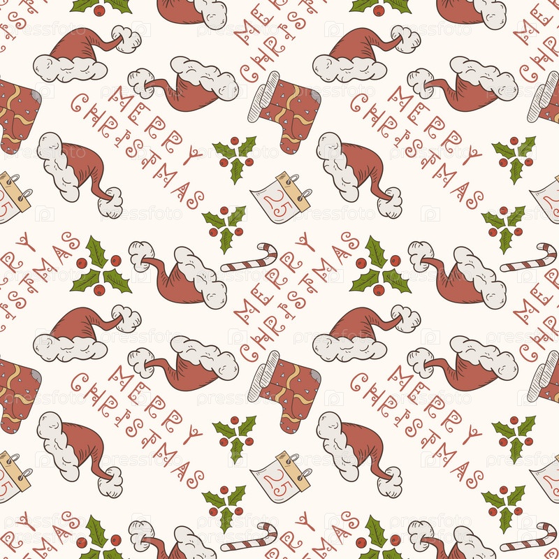 Рождественская цветная бесшовная контурная иллюстрация в стиле детских рисунков подарочные носки и шапка Санты