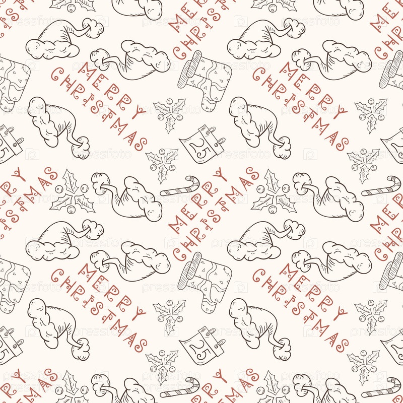 Рождественская бесшовная контурная иллюстрация в стиле детских рисунков подарочные носки и шапка Санты
