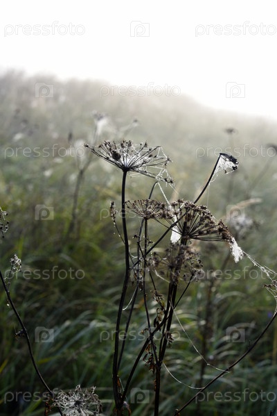 Паутина в росе утром в поле. Паутина