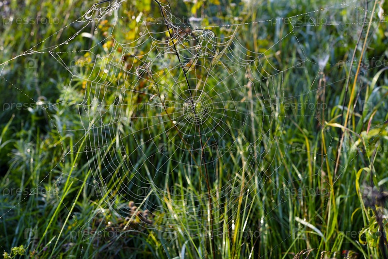 Паутина в росе утром в поле. Паутина
