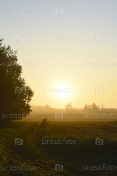Восходящее солнце на утреннем поле. Туманный пейзаж сельской местности