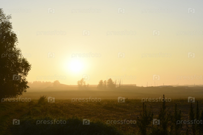 Восходящее солнце на утреннем поле. Туманный пейзаж сельской местности