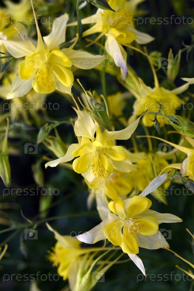 Желтые водоросли цветут в летнем саду. aquilegia vulgaris