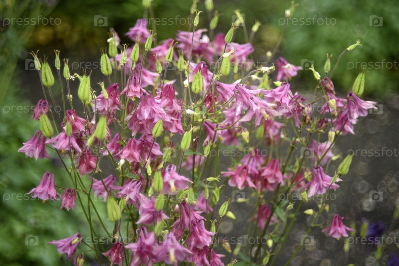 Желто-красные цветы водоема в летнем саду Aquilegia vulgaris Розовые цветки