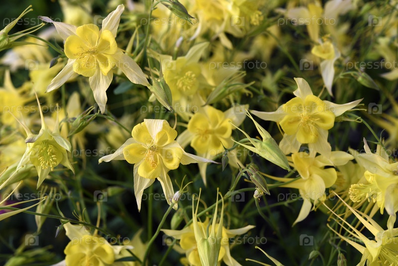 Желтые водоросли цветут в летнем саду. aquilegia vulgaris