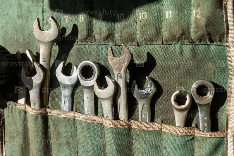 Тканевый органайзер демонстрирует необходимые инструменты для ремонта автомобиля в автомастерской