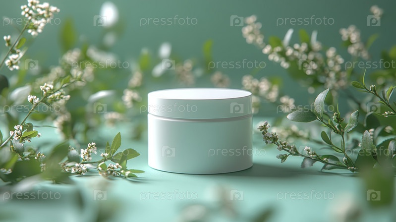 Белая косметическая баночка, окруженная пышной зеленью на нежно-зеленом фоне, символизирует свежесть и естественную красоту