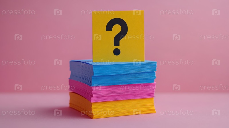 Стопка желтых, розовых и синих стикеров с черным вопросительным знаком