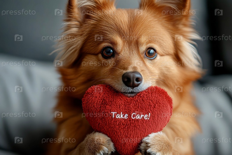 Собака породы шпиц держит в лапах пушистое сердце с надписью Take Care