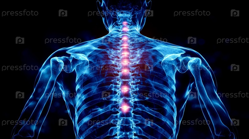 Рентгеновский снимок человеческого тела, на котором кости и вены показаны синим цветом на черном фоне, а также выделена область позвоночника