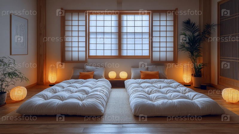 Спокойная спальня в японском стиле с натуральными деревянными полами, белыми стенами и мягким освещением от настенных светильников