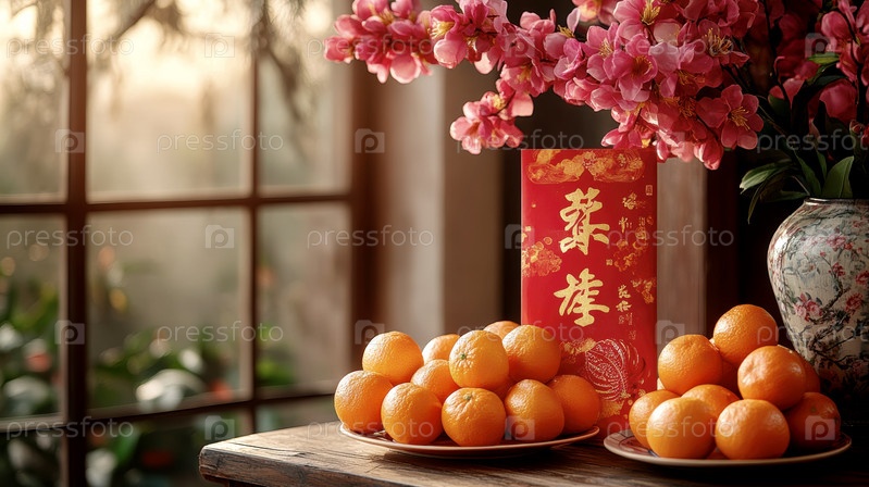 Атмосфера китайского Нового года. На столе тарелка мандаринов и поздравительный красный конверт