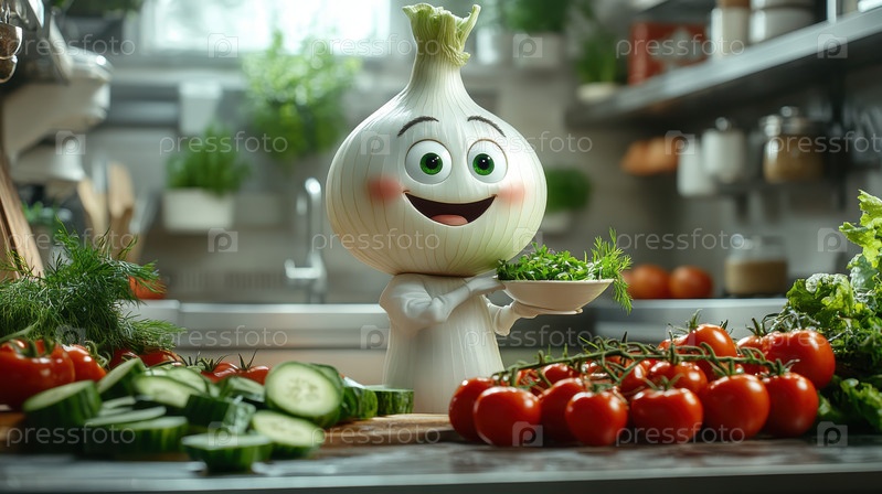 Улыбающийся лук с тарелкой салата в руках стоит возле стола, на котором лежат овощи