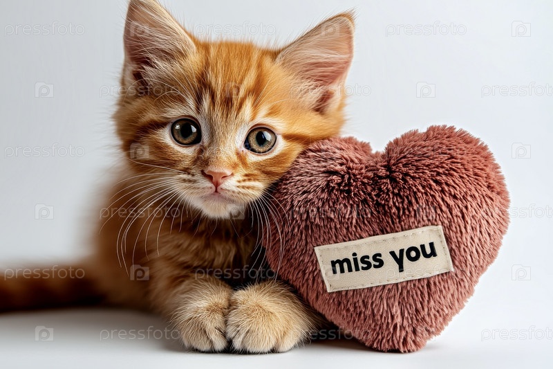 Рыжий котенок рядом с пушистым сердцем с текстом «Я скучаю по тебе» на белом фоне