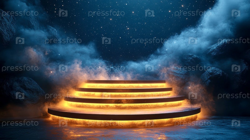 Пустой волшебный желтый подиум с яркой подсветкой для рекламы косметики на фоне облаков и звездного неба