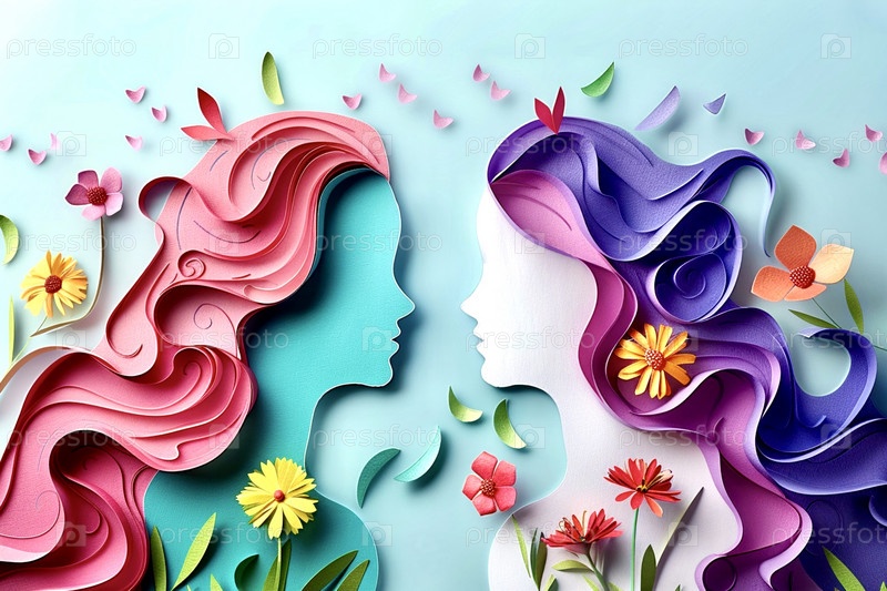 На этом изображении изображены два женских силуэта, сделанных из бумаги, с разноцветными волосами и цветами на мягком фоне, символизирующие единство