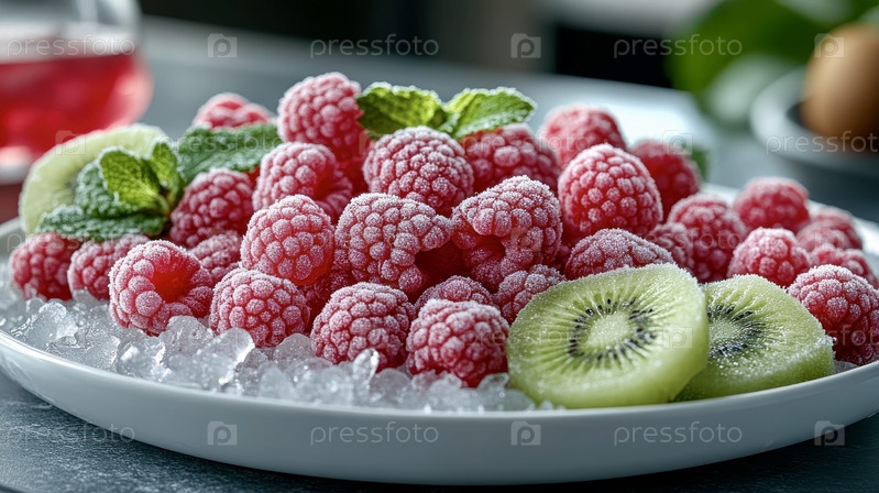 Крупный план замороженной малины, ломтиков киви. Все ягоды и фрукты покрыты инеем и выложены на белой тарелке с кубиками льда в яркой современной кухне