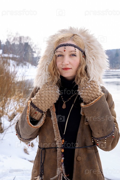 Молодая женщина со светлыми волосами, одетая в теплое кожаное пальто на меху с аксессуарами в стиле бохо, на берегу реки в снежный зимний день