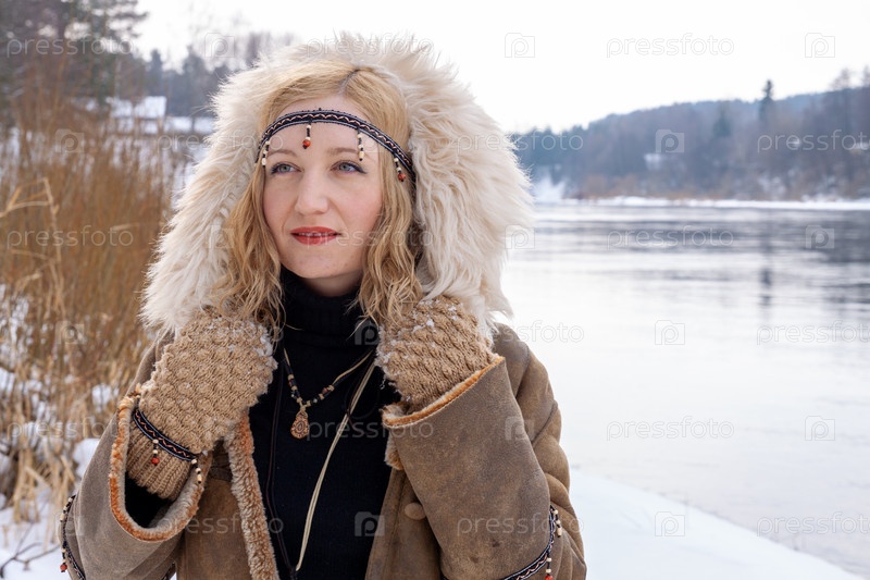 Молодая женщина со светлыми волосами, одетая в теплое кожаное пальто на меху с аксессуарами в стиле бохо, на берегу реки в снежный зимний день