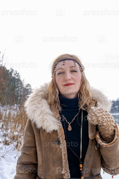 Молодая женщина со светлыми волосами, одетая в теплое кожаное пальто на меху с аксессуарами в стиле бохо, на берегу реки в снежный зимний день
