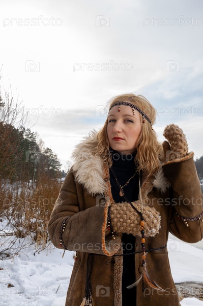 Молодая женщина со светлыми волосами, одетая в теплое кожаное пальто на меху с аксессуарами в стиле бохо, на берегу реки в снежный зимний день