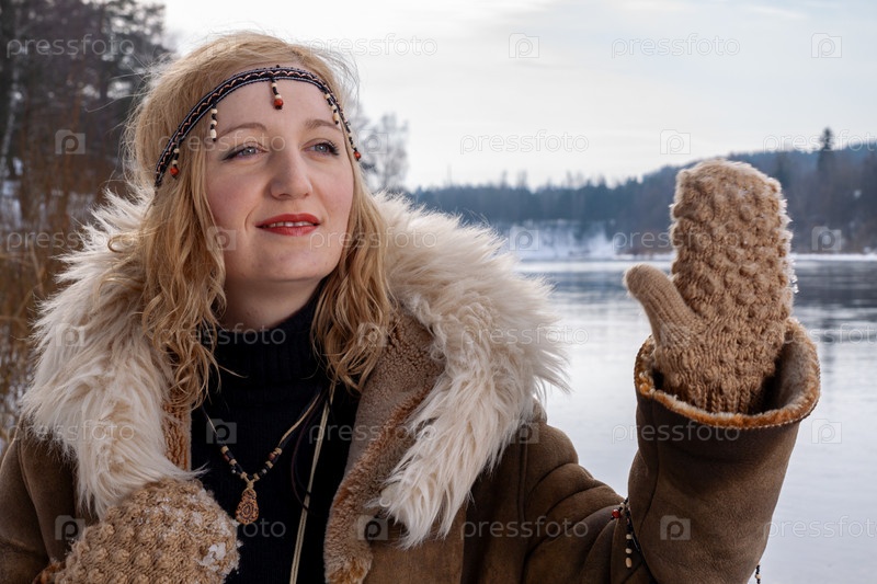 Молодая женщина со светлыми волосами, одетая в теплое кожаное пальто на меху с аксессуарами в стиле бохо, на берегу реки в снежный зимний день