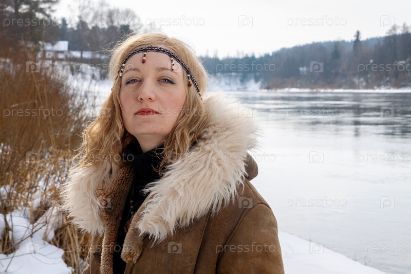 Молодая женщина со светлыми волосами, одетая в теплое кожаное пальто на меху с аксессуарами в стиле бохо, на берегу реки в снежный зимний день