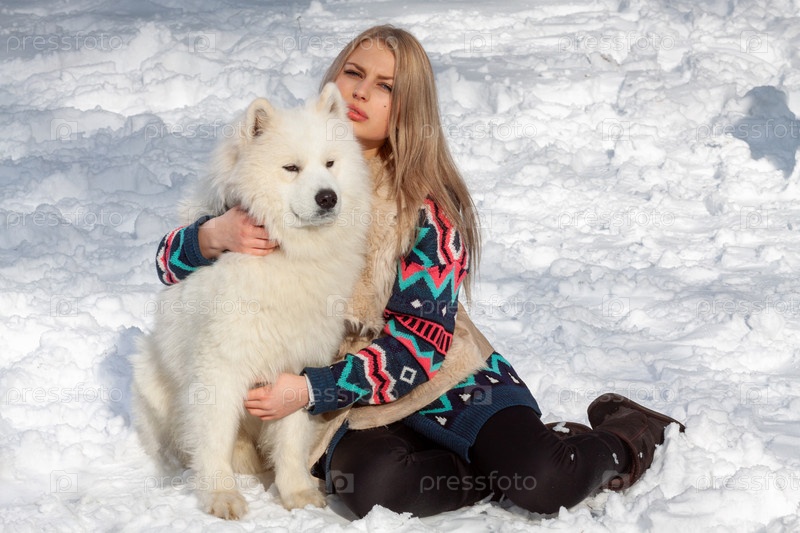 Красивая молодая блондинка с белой собакой породы хаски