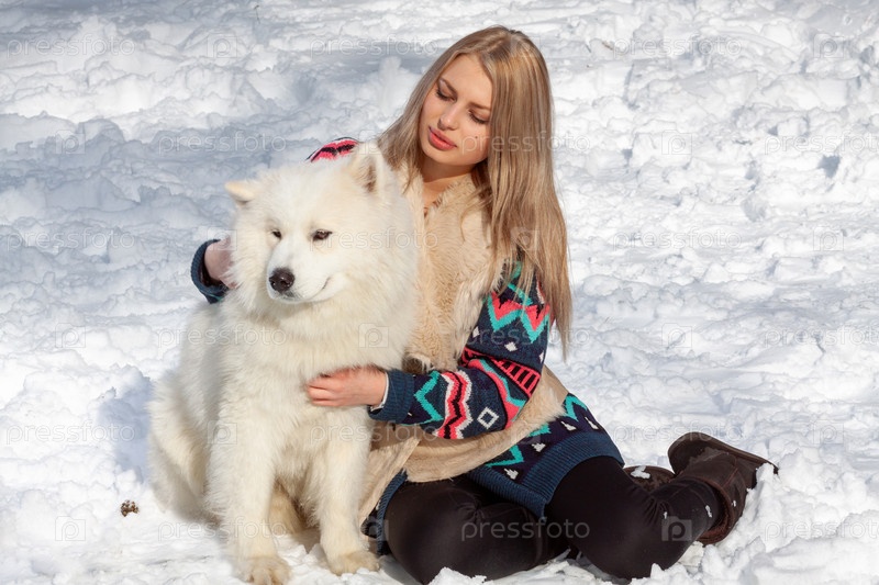 Красивая молодая блондинка с белой собакой породы хаски