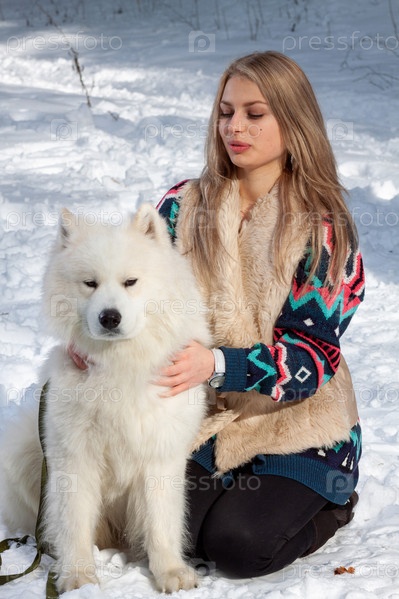 Красивая молодая блондинка с белой собакой породы хаски
