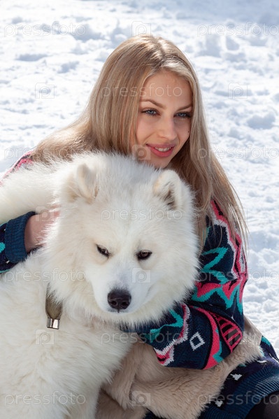 Красивая молодая блондинка с белой собакой породы хаски