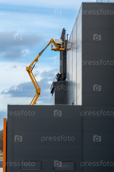 Двое рабочих в касках монтируют элементы наружной видеорекламы на серой стене здания на фоне неба с облаками