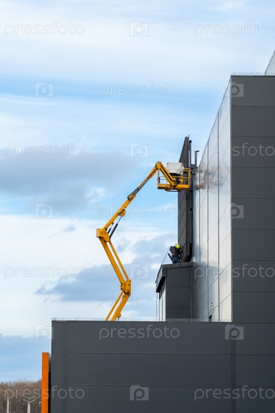 Двое рабочих в касках монтируют элементы наружной видеорекламы на серой стене здания на фоне неба с облаками