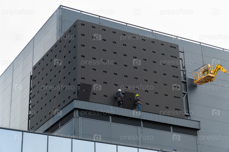Двое рабочих в касках монтируют элементы наружной видеорекламы