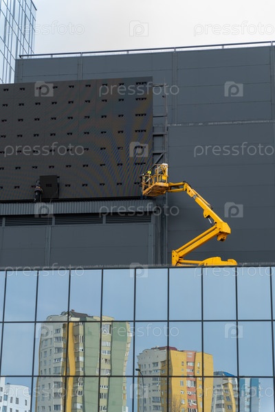 Двое рабочих в касках монтируют элементы наружной видеорекламы на серой стене здания на фоне неба с облаками