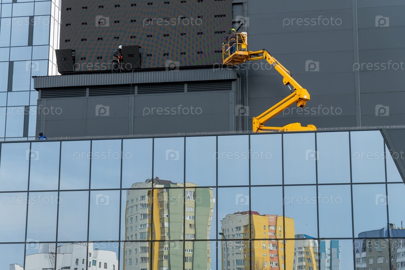 Двое рабочих в касках монтируют элементы наружной видеорекламы