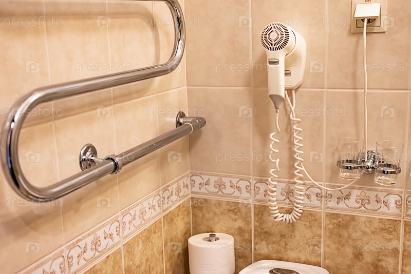 Ванная комната с феном, поручнями, держателями для стаканов и рулоном туалетной бумаги