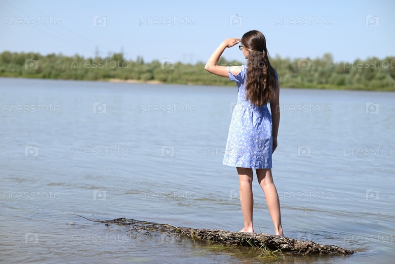 Молодая девушка с длинными темными волосами стоит на берегу реки