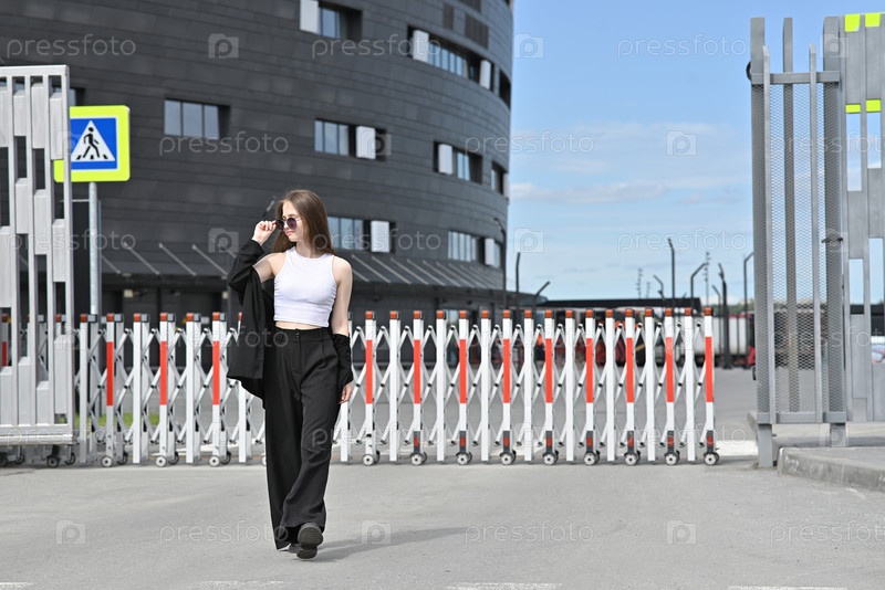 Женщина идет возле раздвижных ворот перед современным зданием