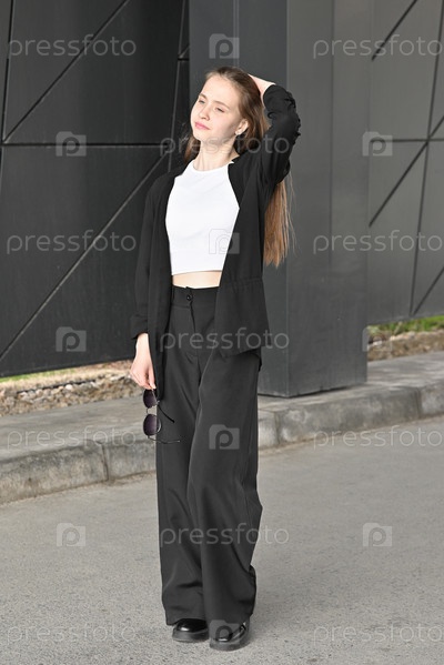 Женщина идет в стильном наряде, держа куртку на плече в городской среде в солнечный день
