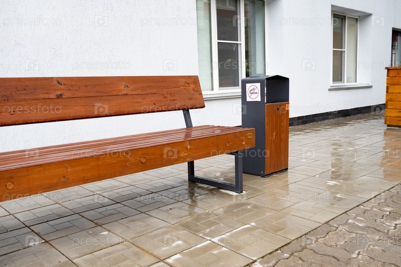 Деревянная скамейка и мусорный бак с табличкой «Курить запрещено» на мокром тротуаре