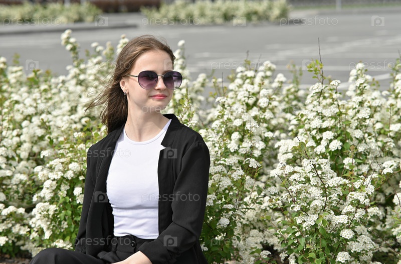 Женщина в солнцезащитных очках улыбается, стоя рядом с цветущими белыми цветами на парковке. Яркая сцена на открытом воздухе, концепция повседневной моды