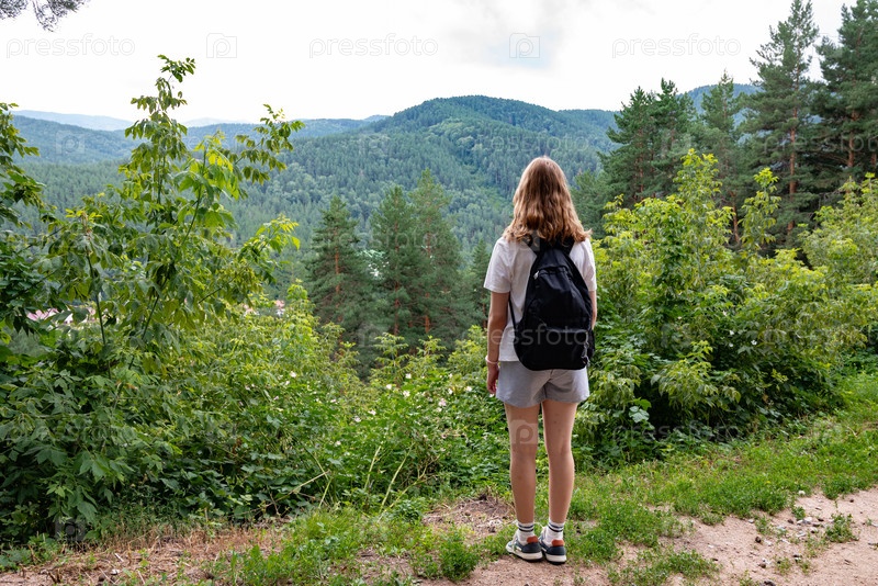 Женщина с рюкзаком стоит на вершине холма, окруженная пышными зелеными деревьями, с видом на огромный лесной ландшафт, концепция приключений и исследования природы