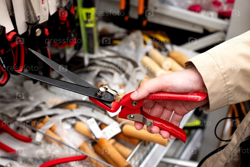 Покупатель выбирает себе садовые ножницы в магазине садовых принадлежностей