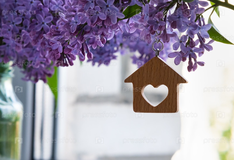 Крупный план ключей и брелка в виде домика на фоне сирени, символа семейного очага и собственного дома. Покупка недвижимости