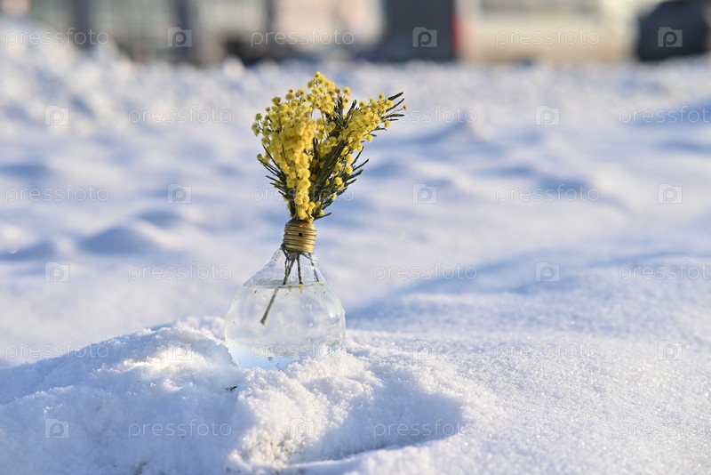 Букет желтых цветов в переделанной вазе-лампочке, помещенной на снег. Солнечный фон на открытом воздухе. Концепция переработки и креативности