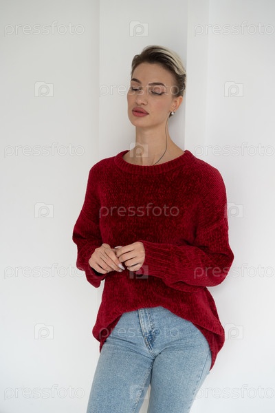 Молодая красивая женщина позирует в красном свитере в студии